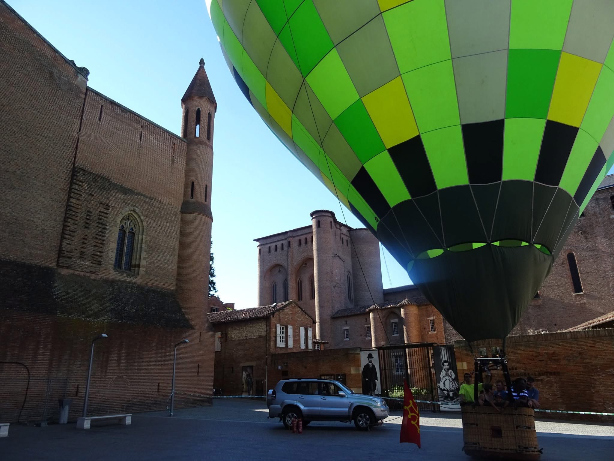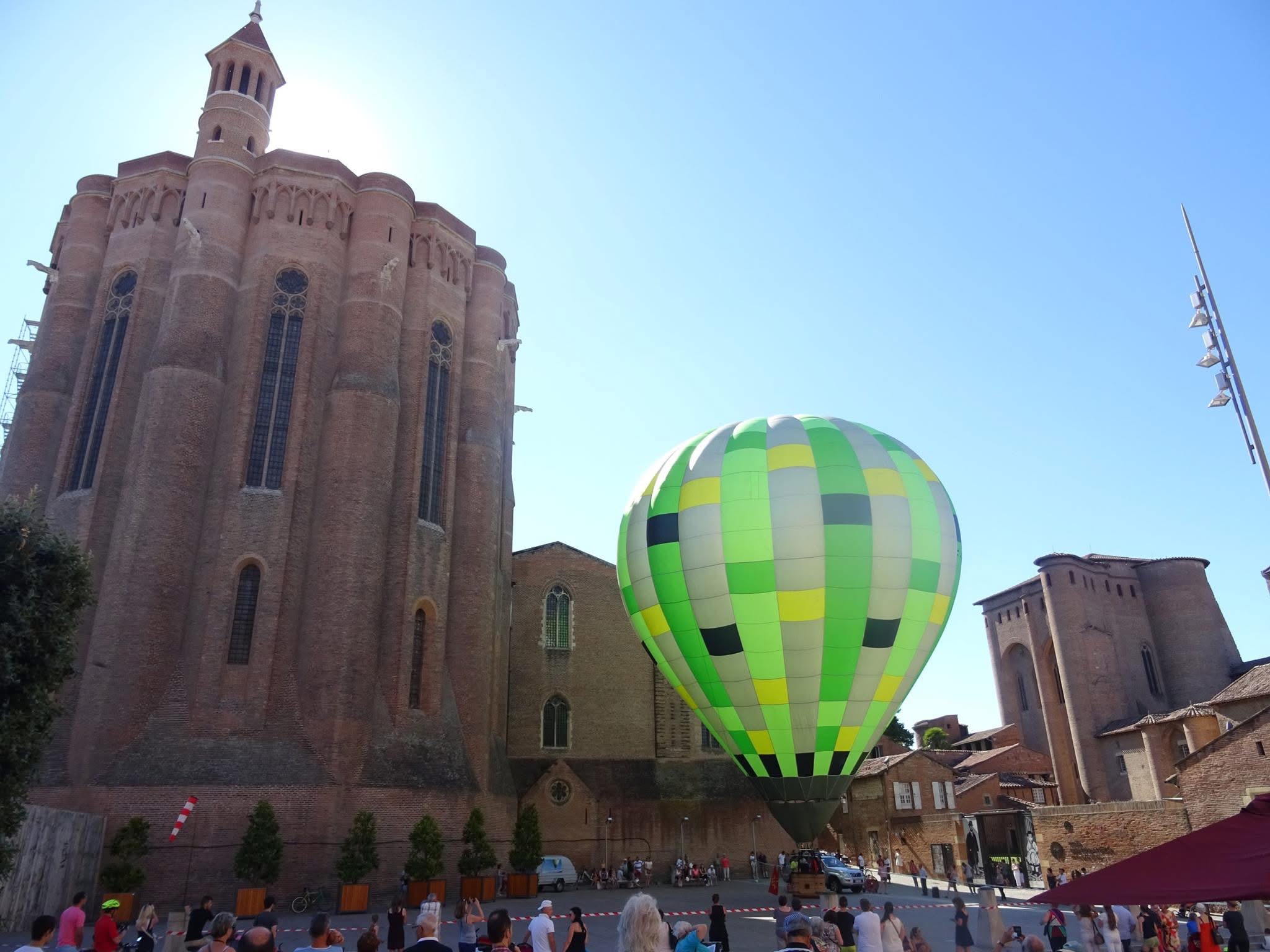 Installer une montgolfière au pied de la majestueuse Cathédrale Sainte-Cécile d'Albi n'est pas courant, loin de là, et nous avons la chance de pouvoir offrir aux passants ce spectacle original. Le gonflage de l'un des ballons d'Atmosph'Air s'est déroulé à quelques pas du célèbre Musée Toulouse-Lautrec et du marché couvert d'Albi, un cadre exceptionnel sublimé par les briques rouges typiques de la cité épiscopale.